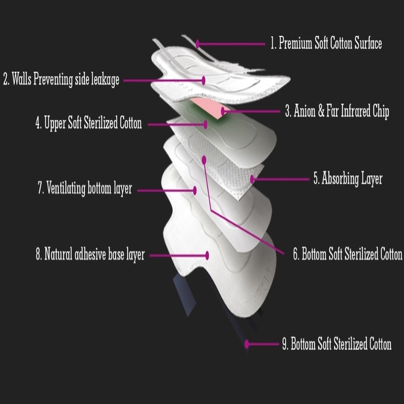 By improving the nuclear technology through research, we discovered a new technology called the Anion and Far Infrared technology designed in our sanitary napkins.